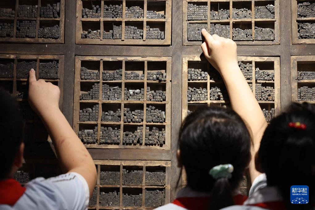 7月20日,在河北省沧州市吴桥县河北线装书博物馆,吴桥县新华小学学生学习了解铅字印刷工艺。