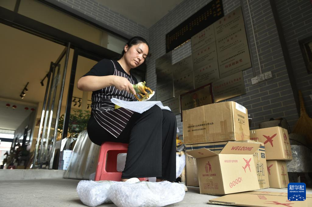 7月20日,南石山村一家唐三彩生产企业的工人在打包唐三彩作品准备外销。