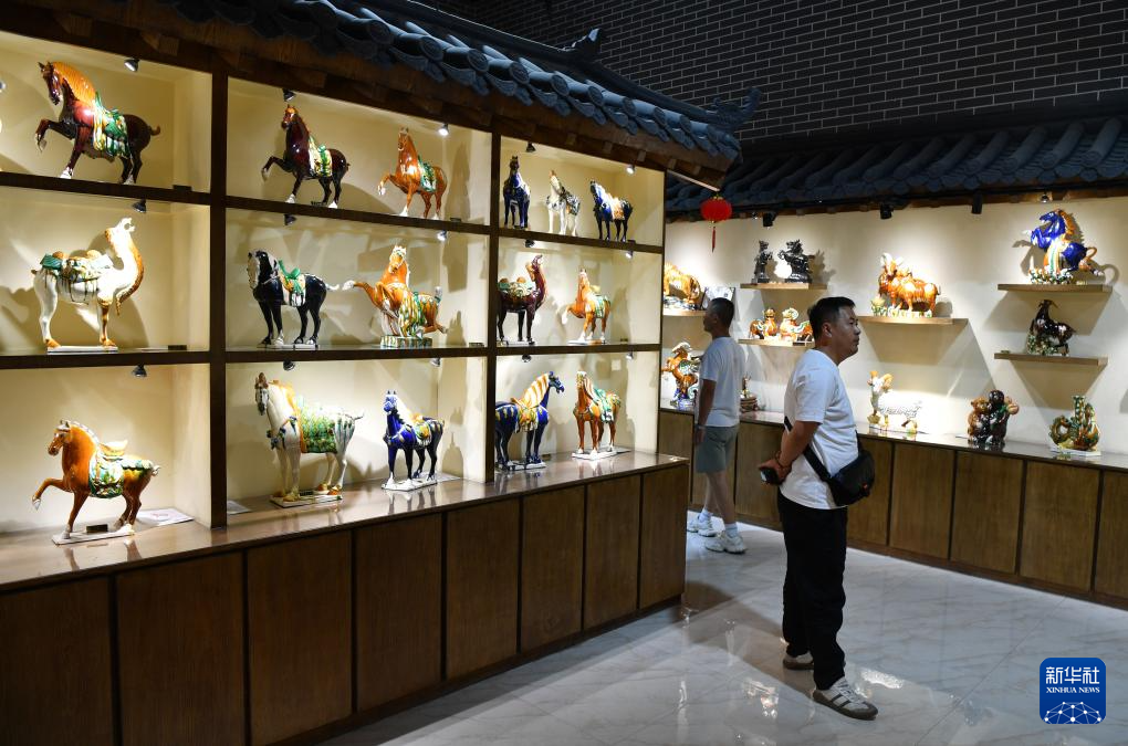 7月19日,顾客在南石山村一家唐三彩生产企业的展厅里参观。
