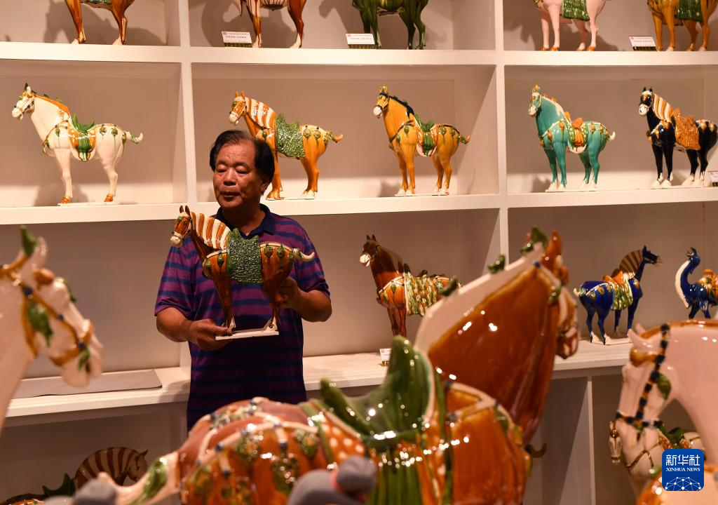 这是7月19日在南石山村一家唐三彩生产企业的展厅里拍摄的唐三彩作品。