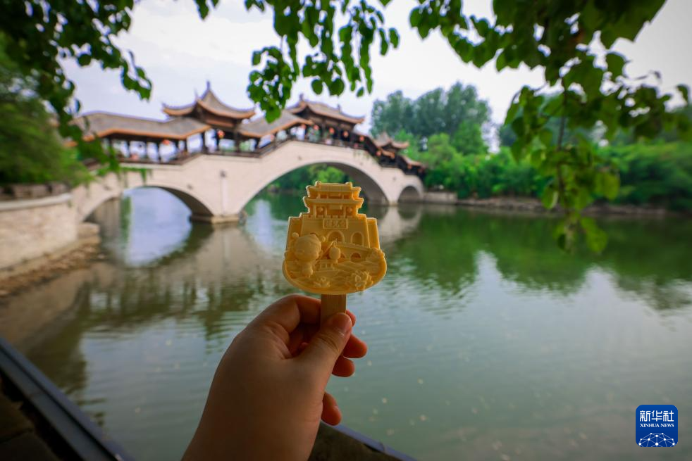 7月20日在山东省枣庄市台儿庄古城拍摄的台儿庄古城墙造型文创雪糕。