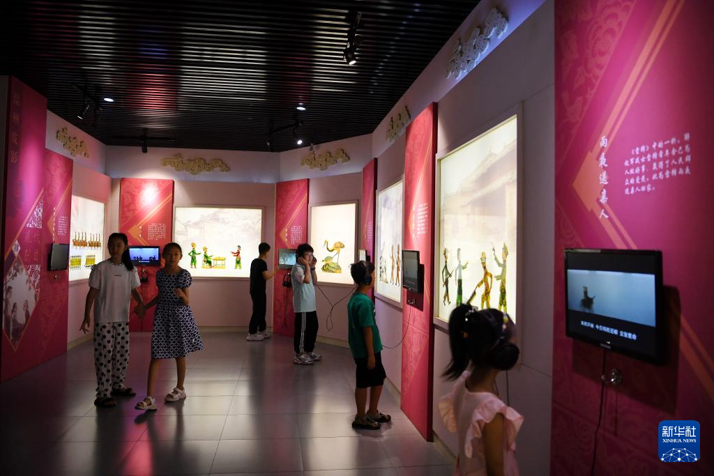 7月21日,孩子们在中国滦州皮影博物馆内参观。