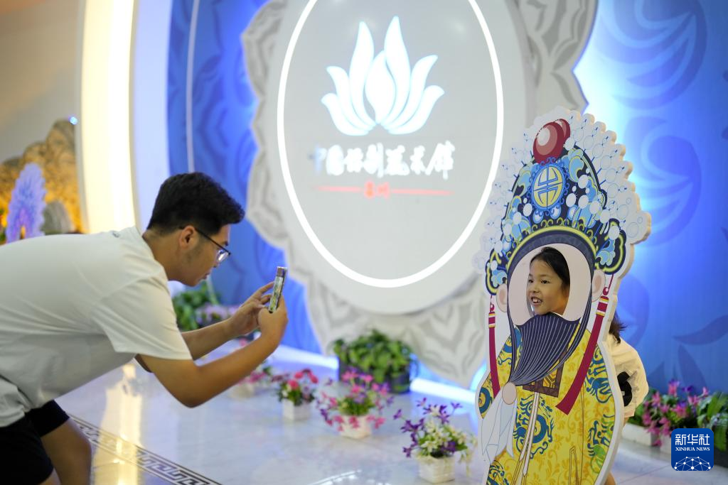 7月21日,在位于河北省滦州市的中国评剧艺术馆,家长在给孩子拍照。