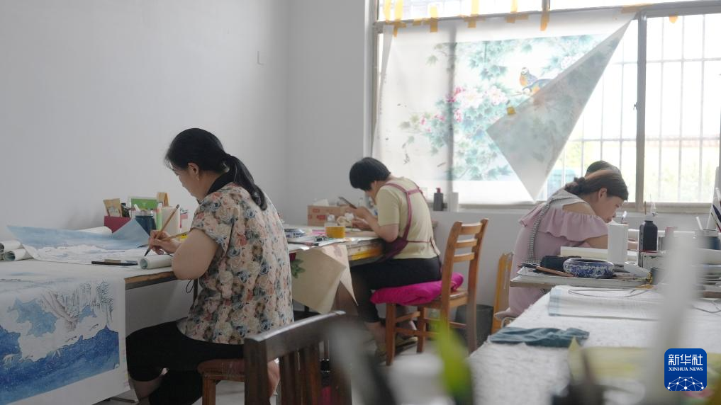 7月24日,画师在山东省巨野县永丰街道办事处洪庙村乡村画院绘制工笔画作品。
