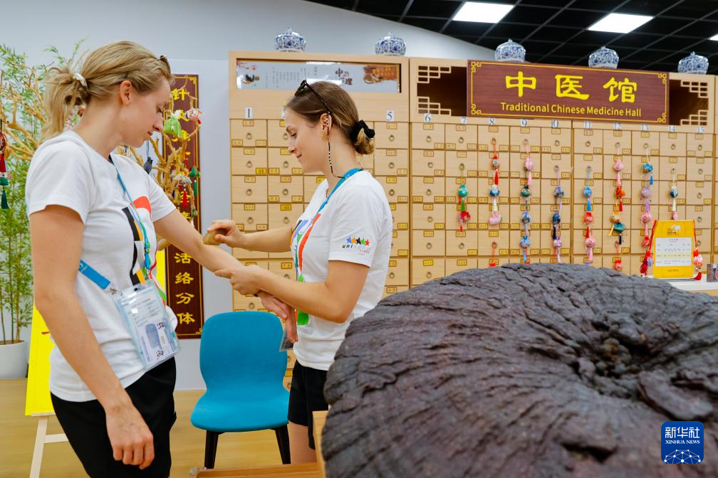 7月31日,在成都大运村,两名奥地利代表团成员在体验中医刮痧板。