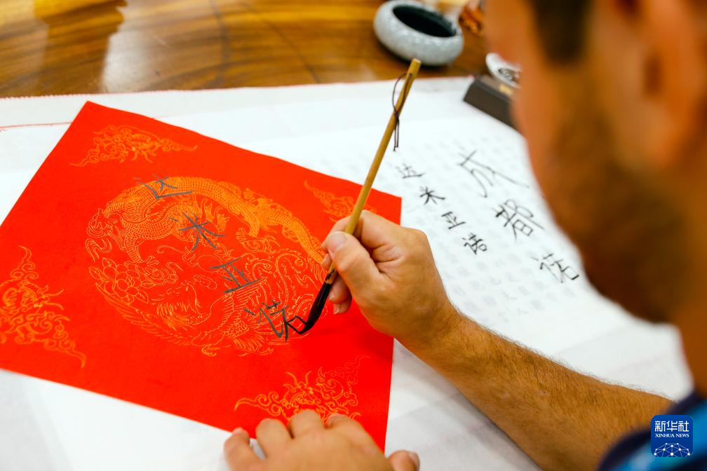 7月31日,在成都大运村,来自意大利的达米亚诺·多梅尼科·瓦莱里奥(右)学习用汉字书写自己的名字。