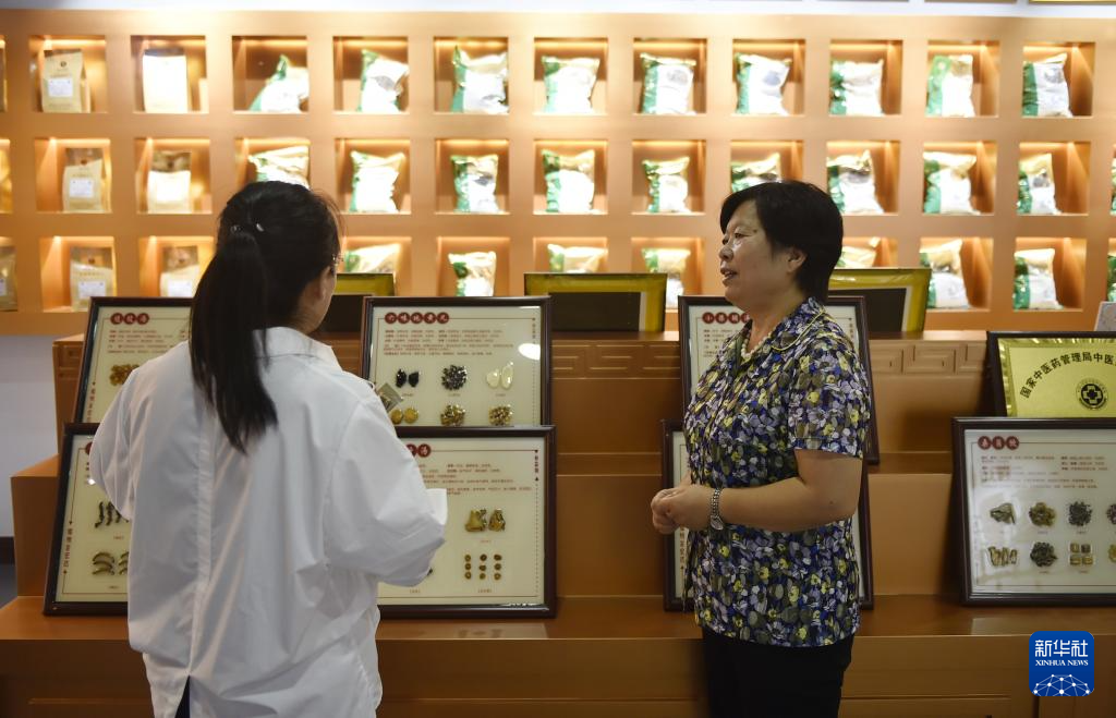 8月4日,在禹州中医药文化技艺传习馆,非遗项目“禹州中药加工炮制技艺”代表性传承人朱改莲(左)向参观者介绍中药材知识。