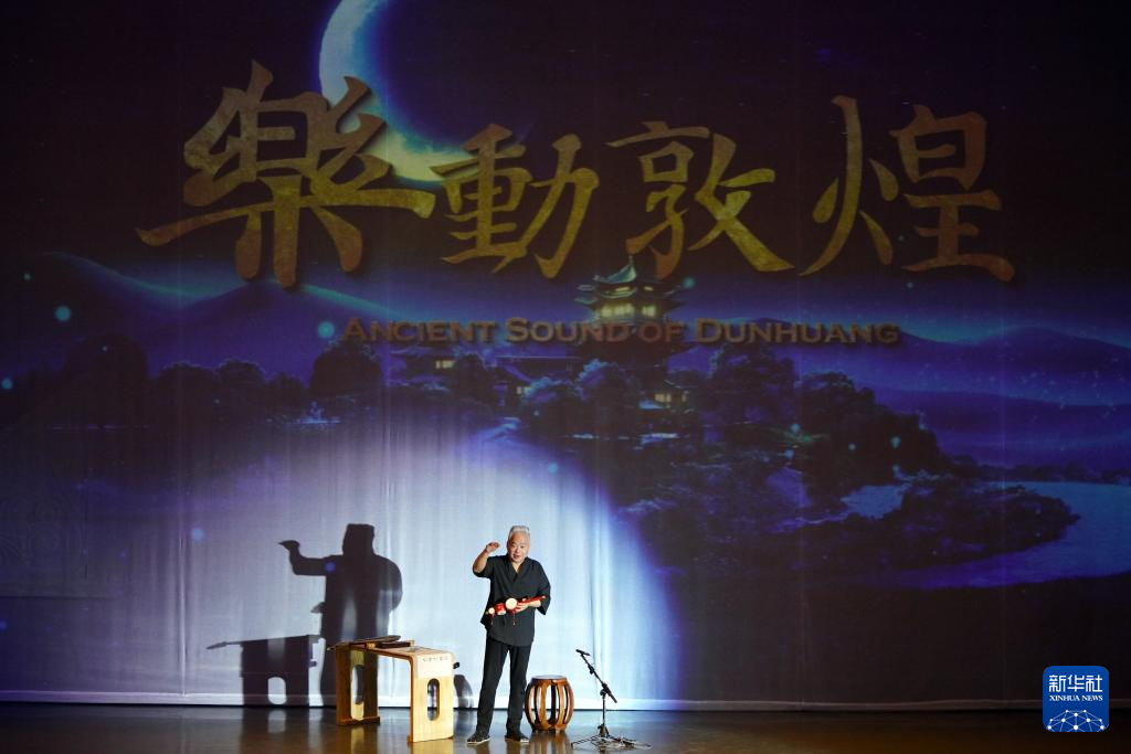 8月9日,在《乐动敦煌》演出现场,敦煌古乐全球推广大使、国乐艺术家方锦龙在向观众介绍传统音乐。