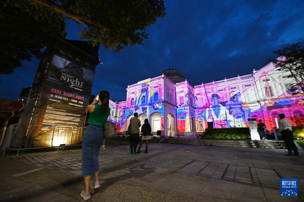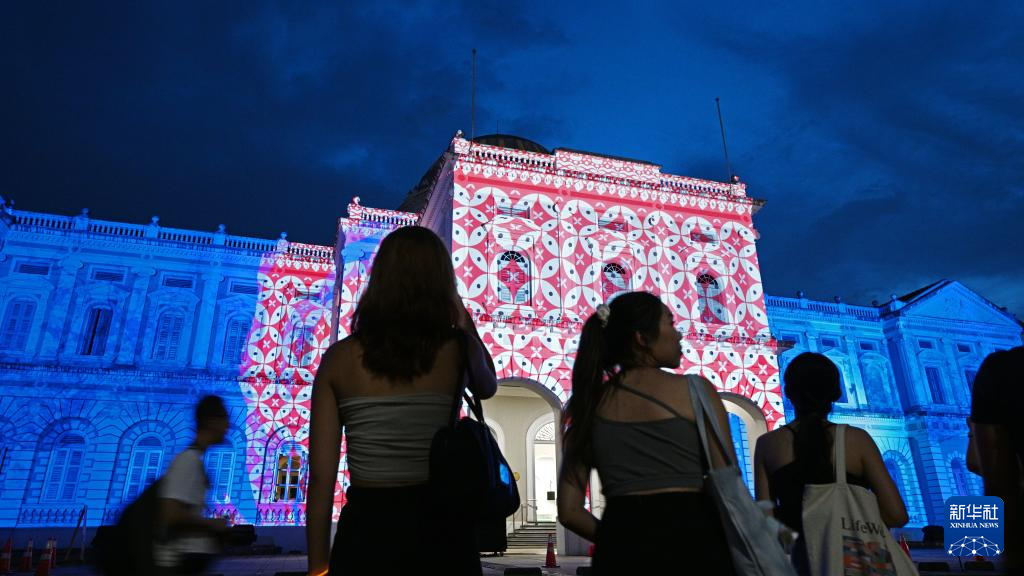 8月16日,观众在新加坡举行的“新加坡仲夏夜空”艺术活动预展上欣赏灯光投影秀。