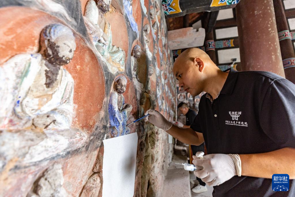8月19日,在大足石刻宝顶山景区,工作人员对石刻造像病害进行处理。