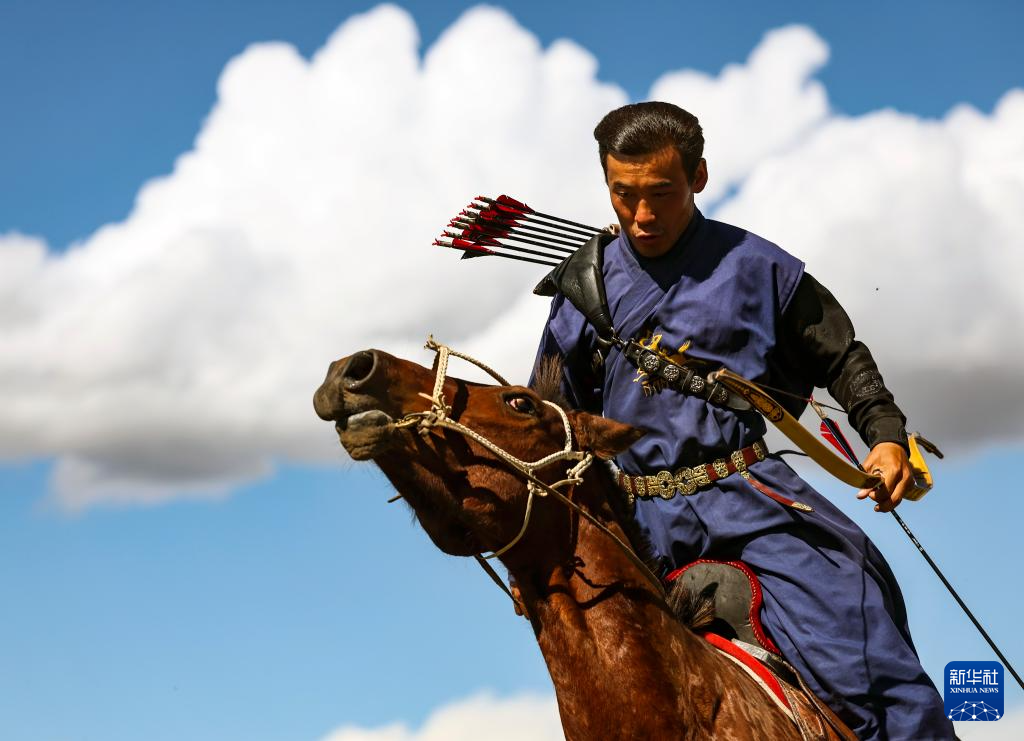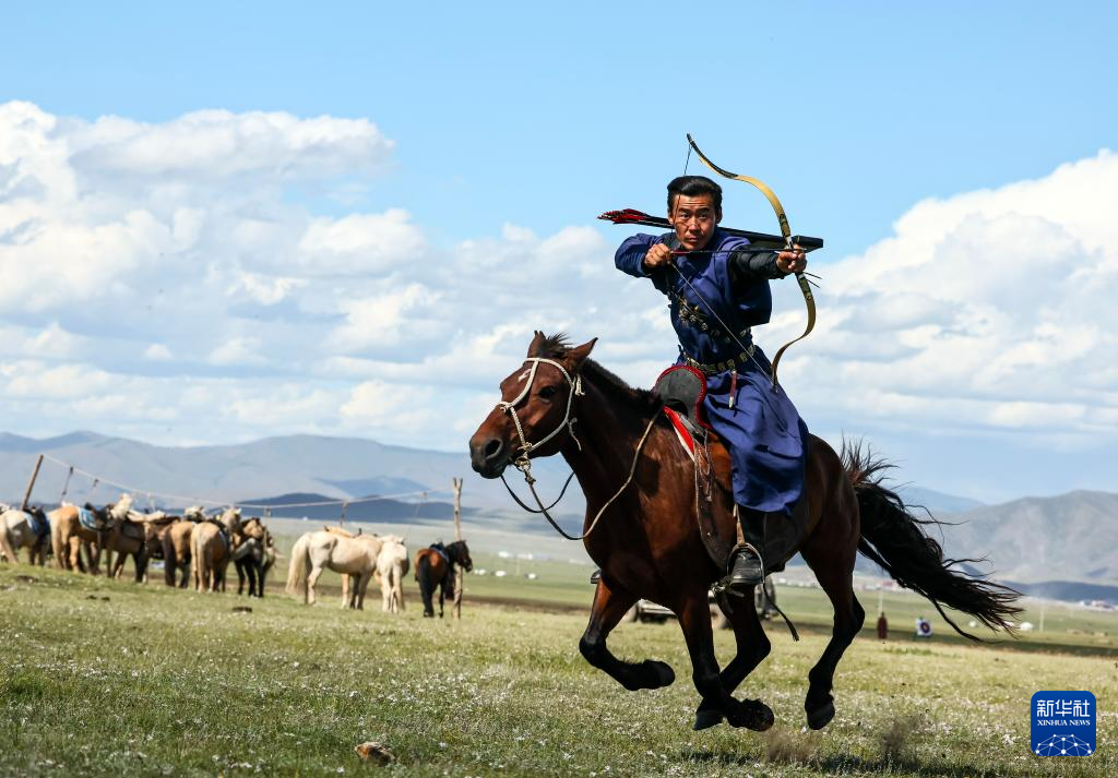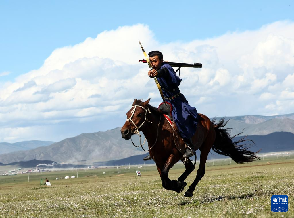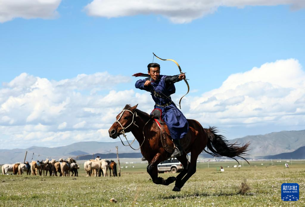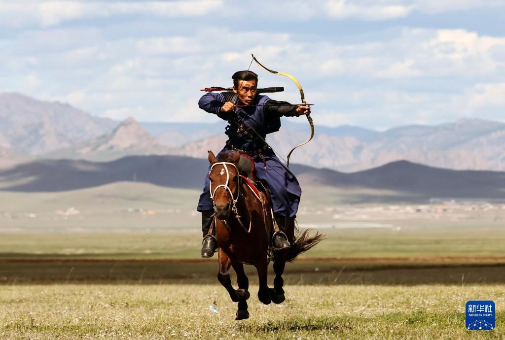 8月19日,在蒙古国泰吉山谷,选手在蒙古国“游牧民族”世界文化节上展示骑马射箭。