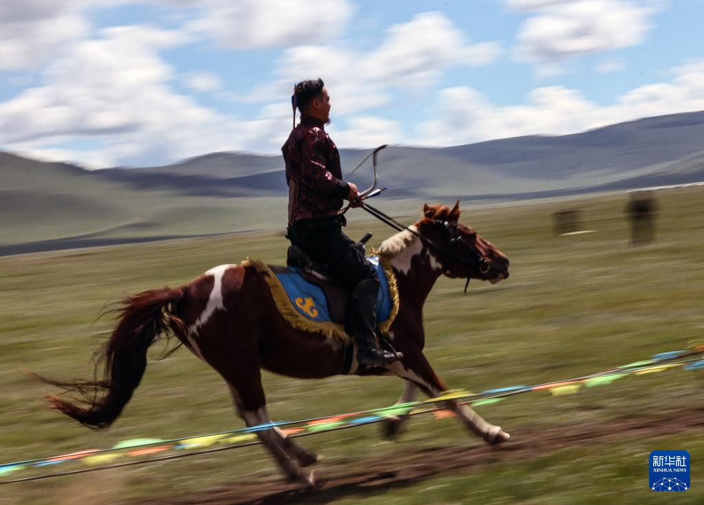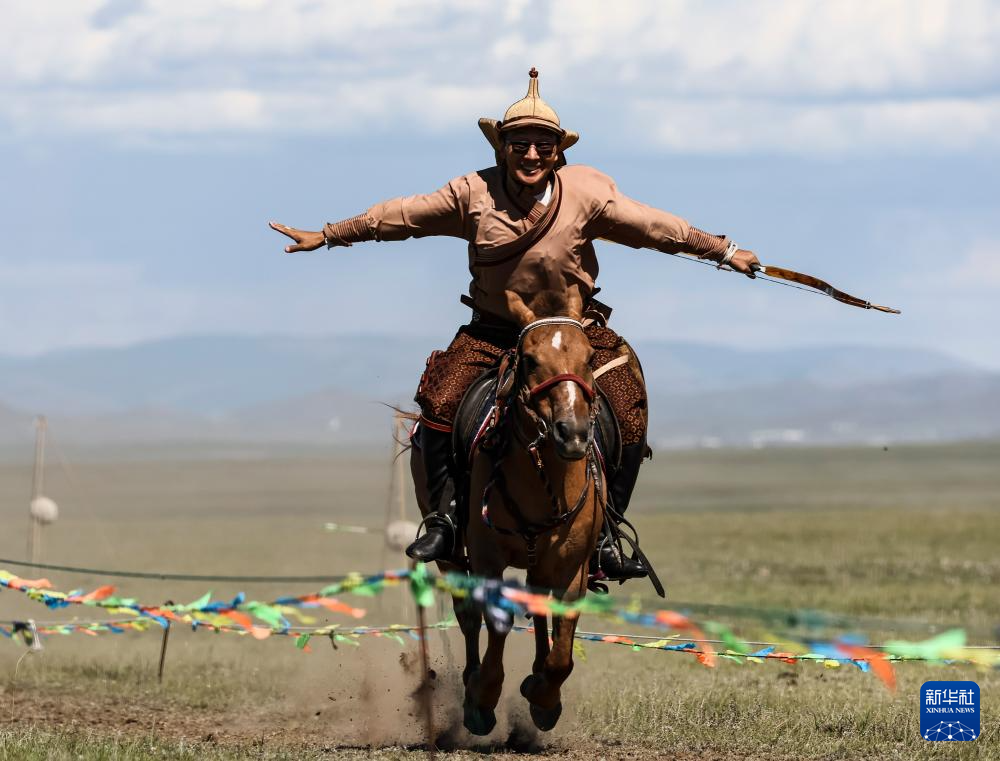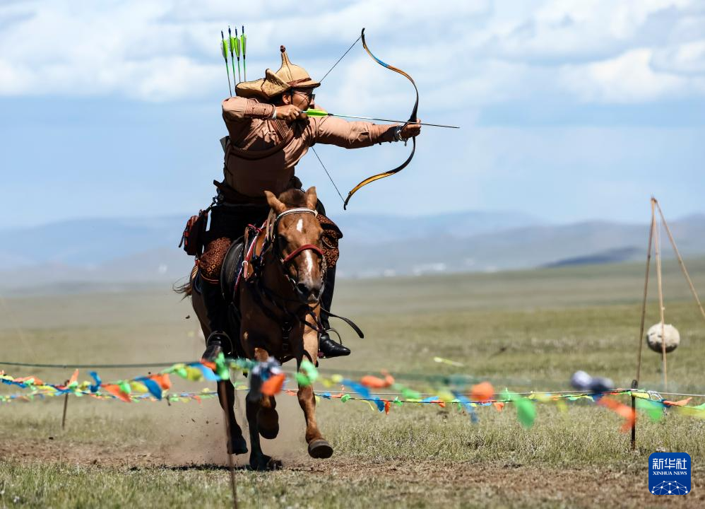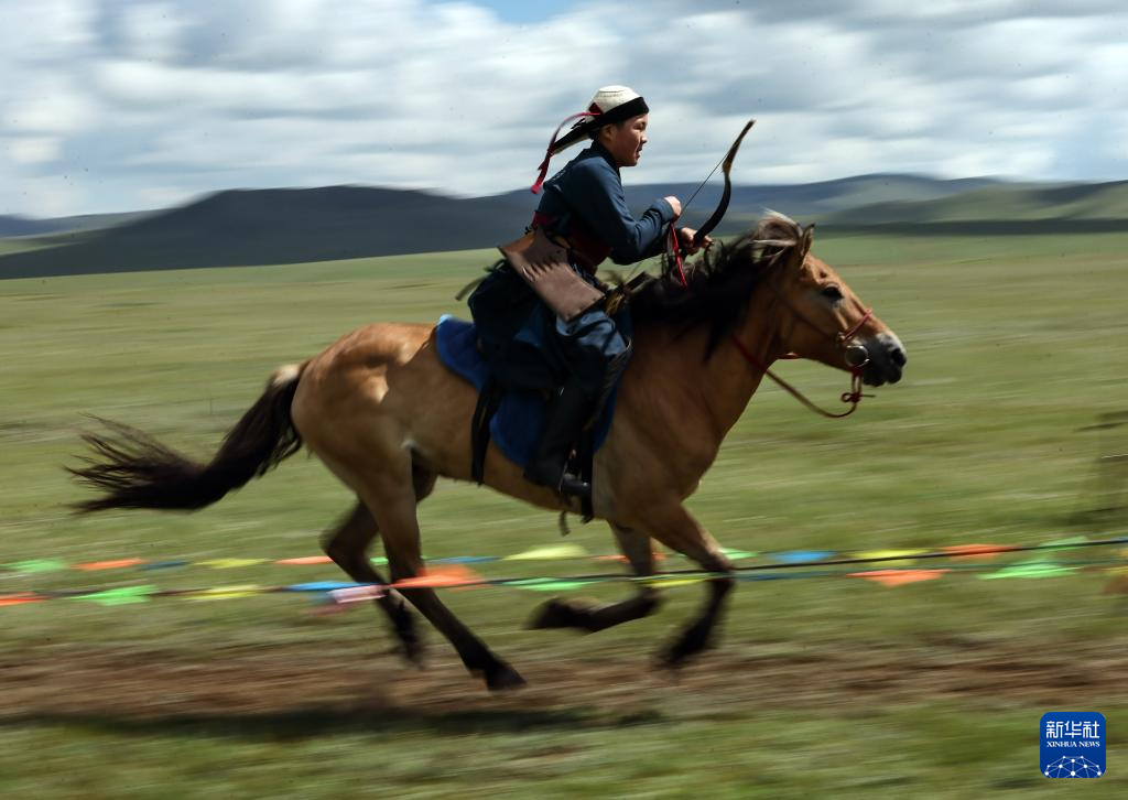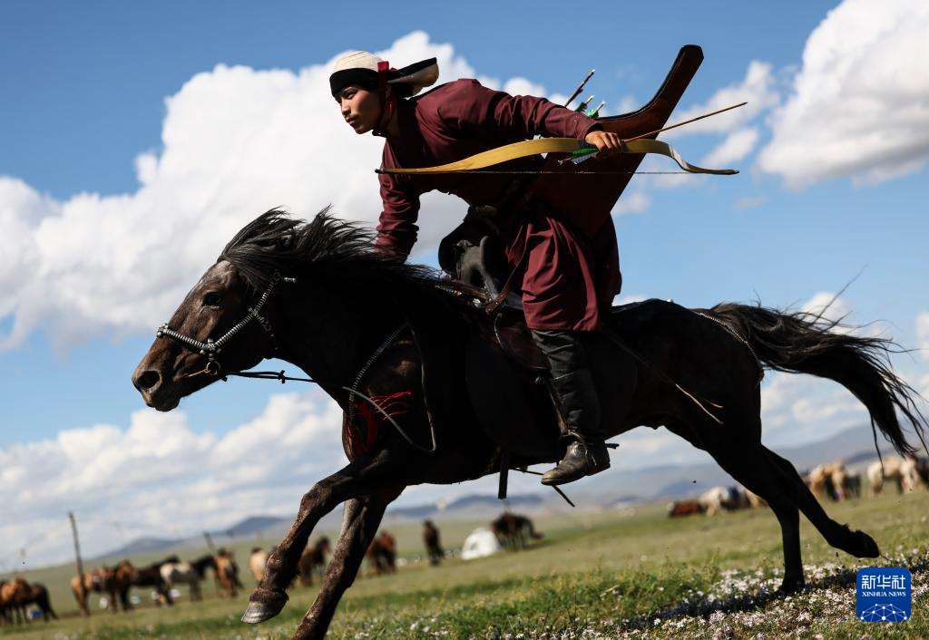 8月19日,在蒙古国泰吉山谷,选手在蒙古国“游牧民族”世界文化节上展示骑马射箭。