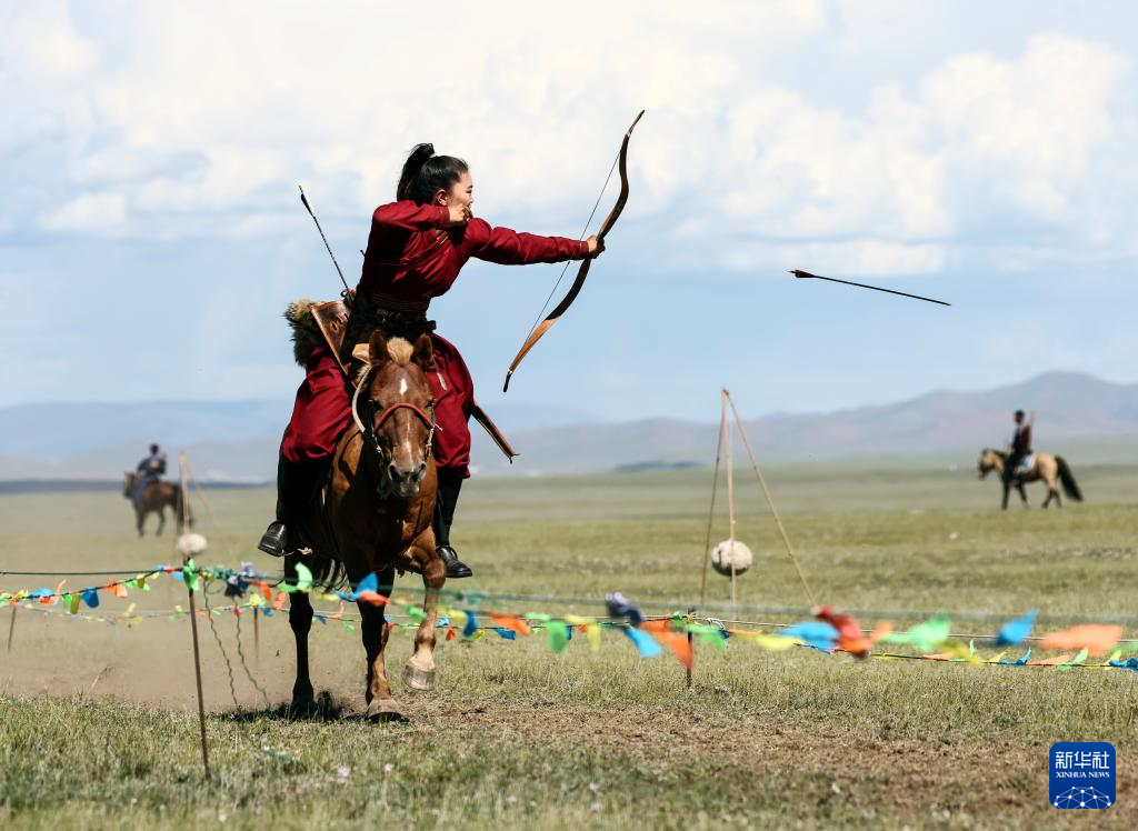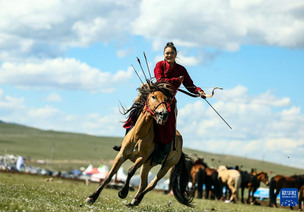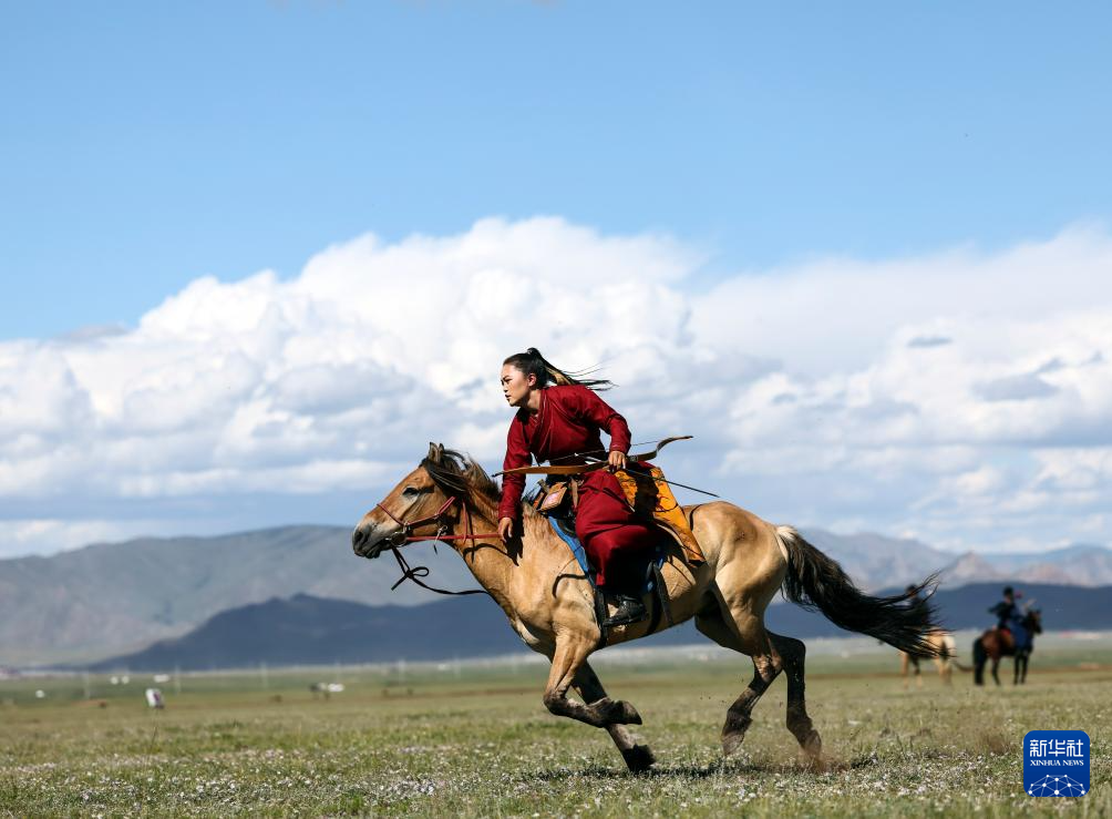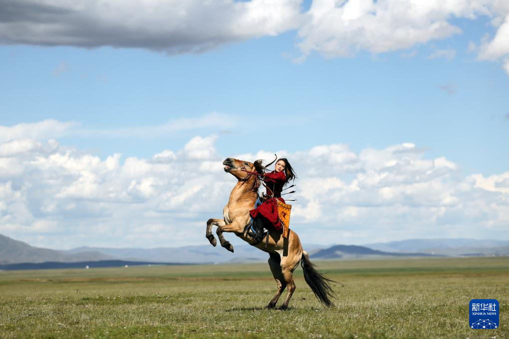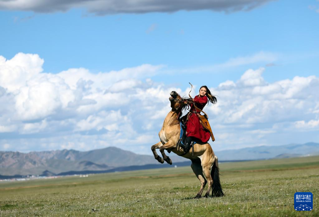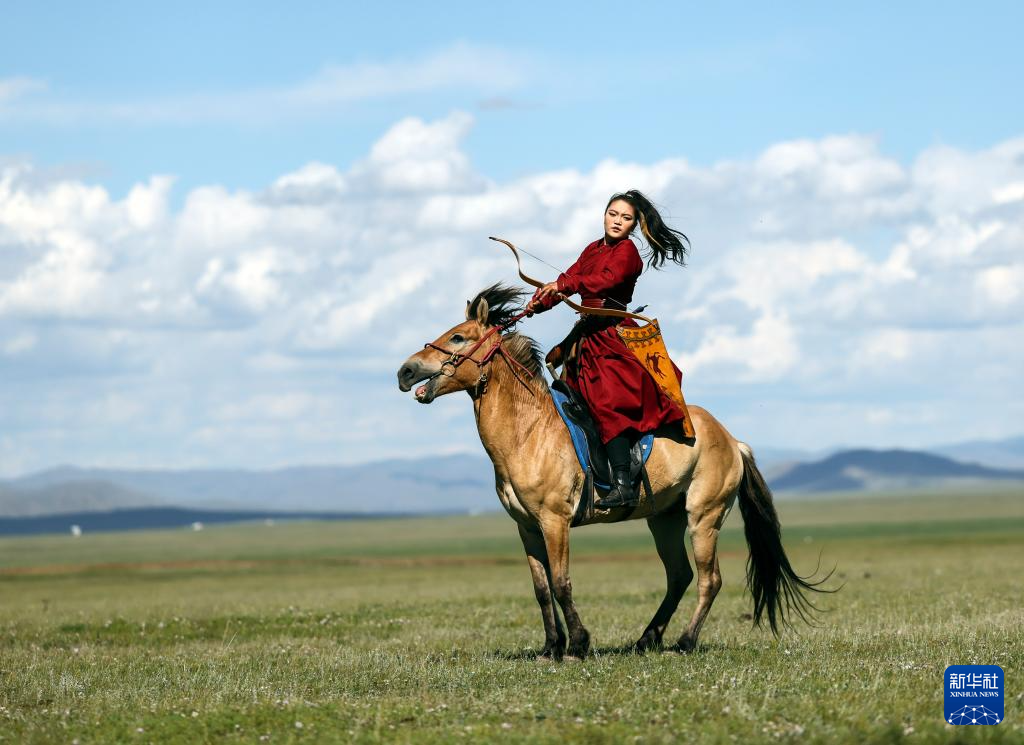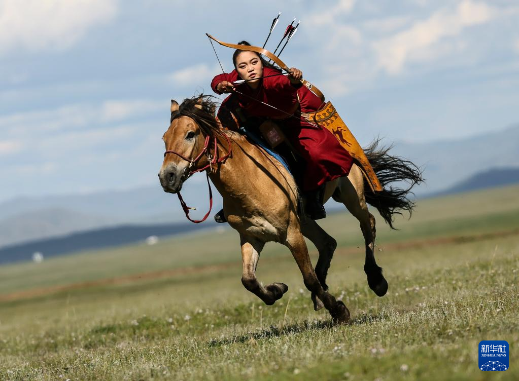 8月19日,在蒙古国泰吉山谷,一名女选手在蒙古国“游牧民族”世界文化节上展示骑马射箭。