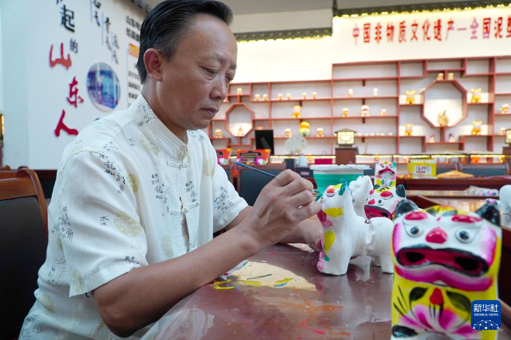 9月5日,在山东省高密市姜庄镇的一处非遗工坊,非遗代表性传承人聂臣希在制作泥老虎产品。