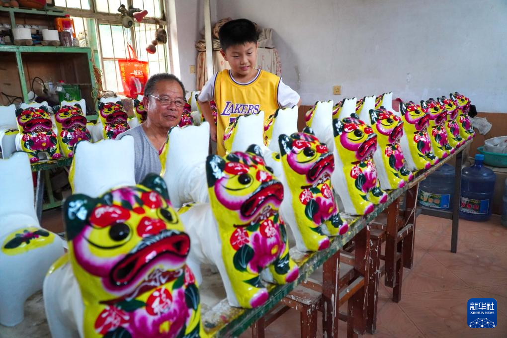 9月5日,在山东省高密市姜庄镇的一处非遗工坊,非遗代表性传承人聂宏希(右)在制作泥老虎产品。