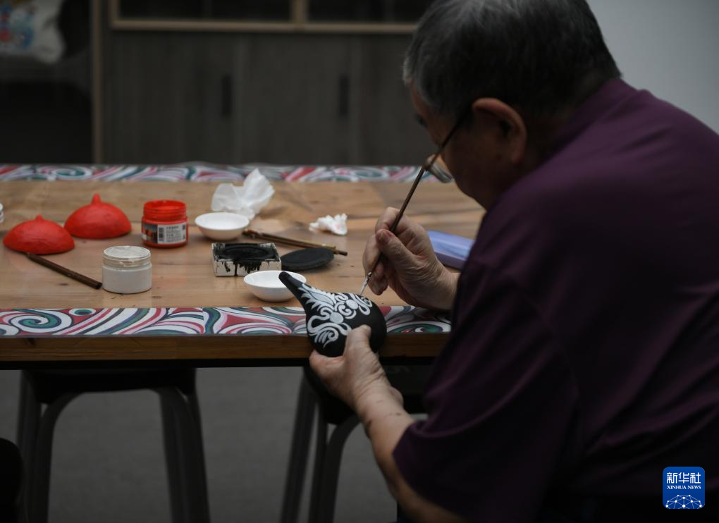 9月8日,在陕西宝鸡市西府里文化艺术村,中国工艺美术大师、陕西省非物质文化遗产社火脸谱绘制技艺代表性传承人李继友在绘制马勺脸谱。