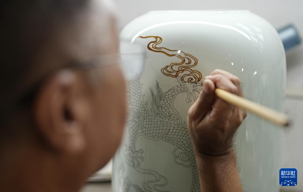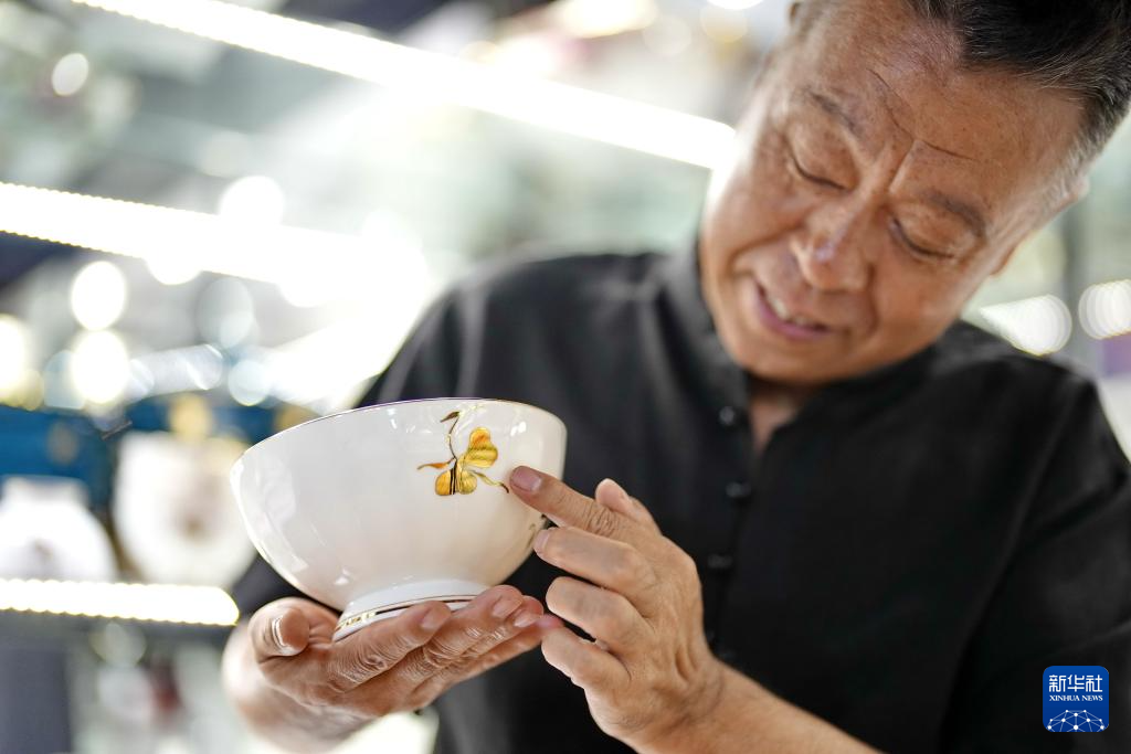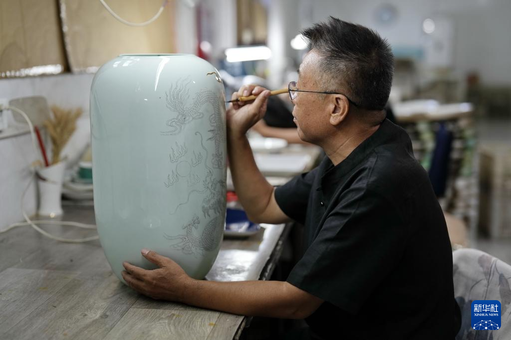 9月12日,戴佩维在进行陶瓷雕金创作。