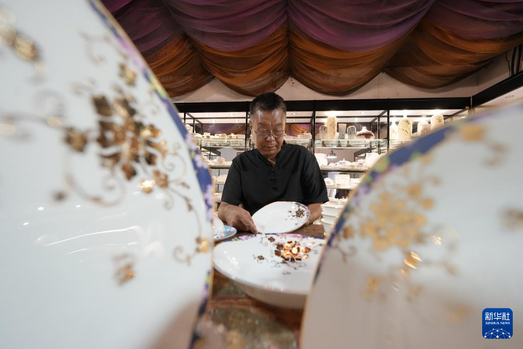9月12日,戴佩维在整理陶瓷雕金作品。