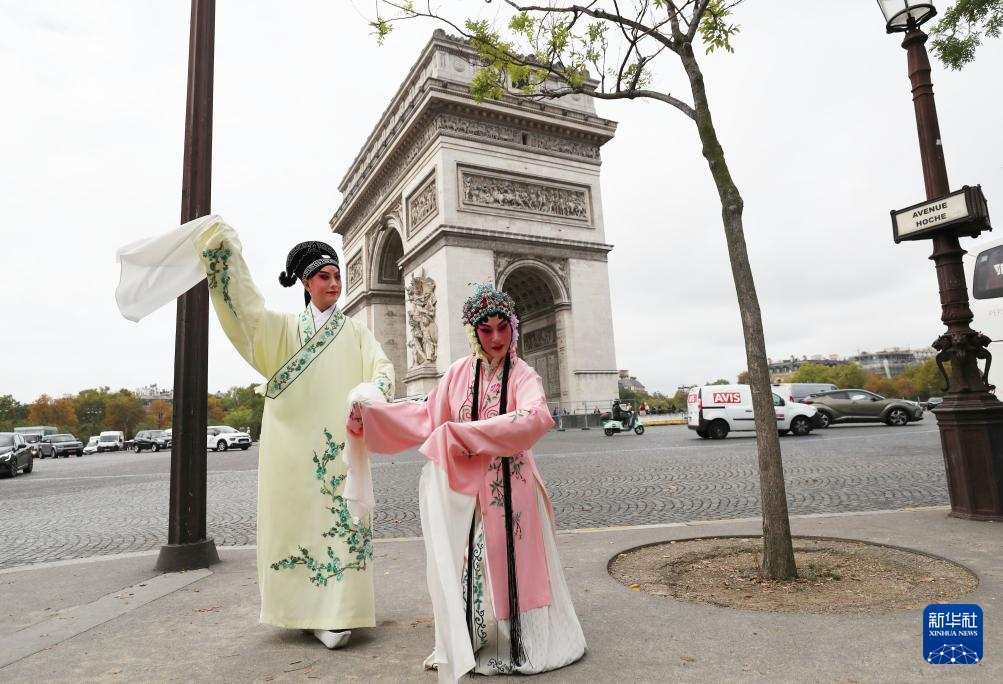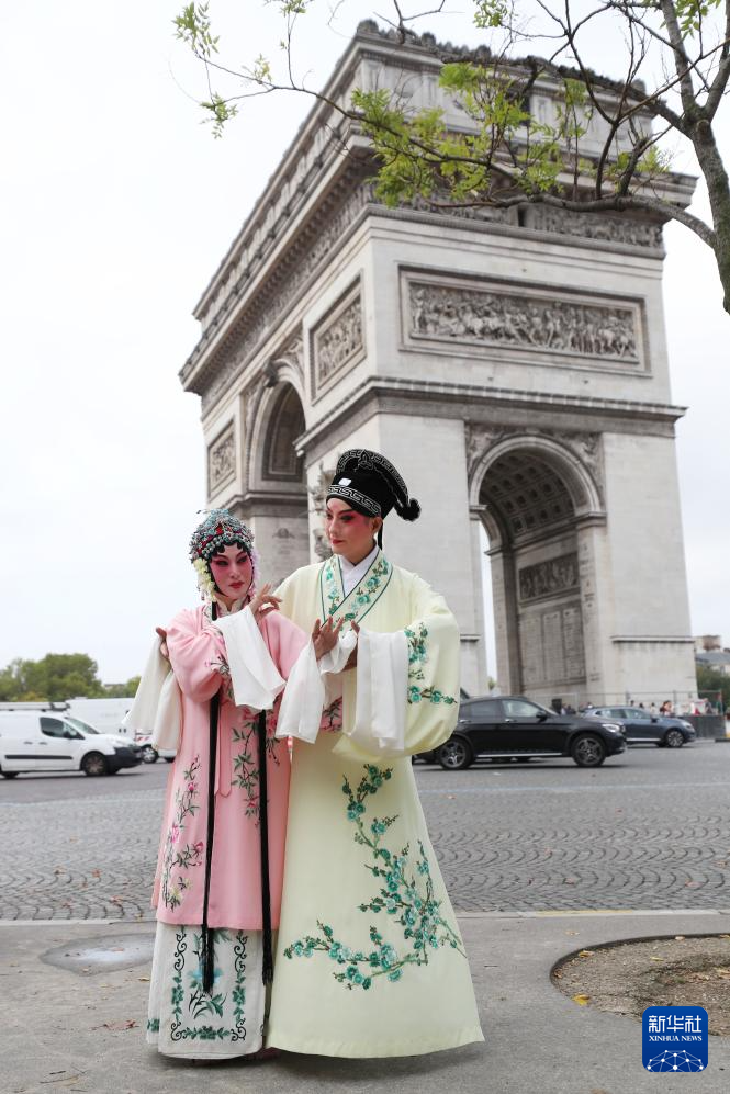 9月13日,江苏省演艺集团昆剧院院长施夏明(右)和江苏省演艺集团昆剧院国家一级演员孔爱萍在法国巴黎凯旋门附近参加昆曲快闪。