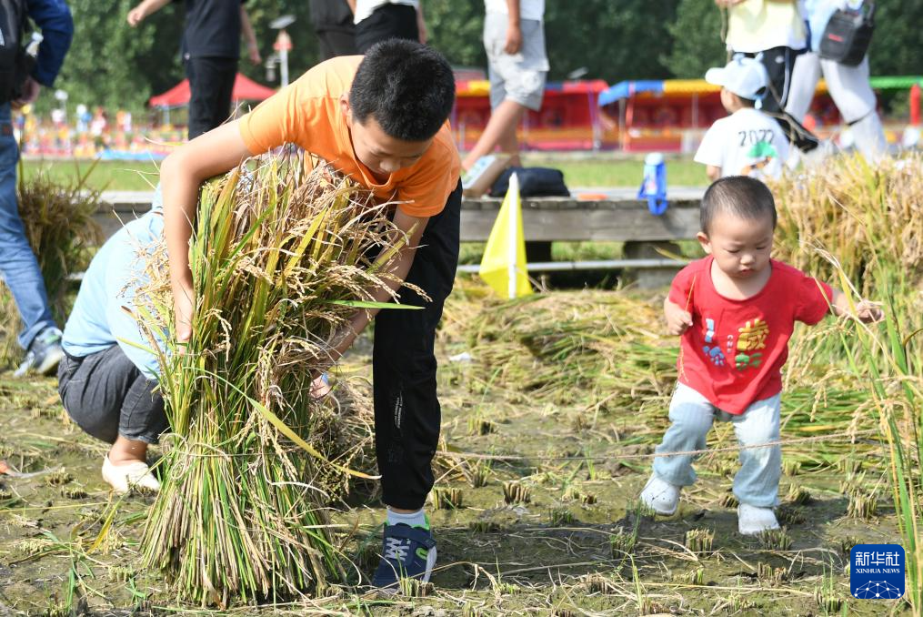 9月23日,我国迎来第6个中国农民丰收节。北京市海淀区上庄镇在西马坊京西稻田举办首届“稻香传韵 非遗承情”文化艺术节活动。市民在活动中品美食、赏稻田风光、参与割稻子比赛等趣味项目,乐享秋日美好时光。