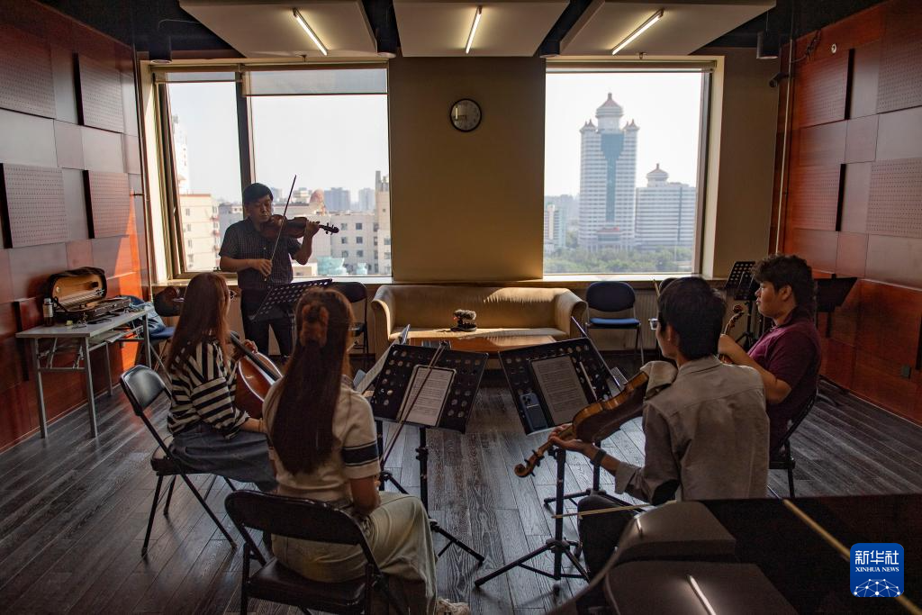 9月14日,中央音乐学院教授于兵(左二)在指导学生练习海顿的弦乐四重奏《云雀》。