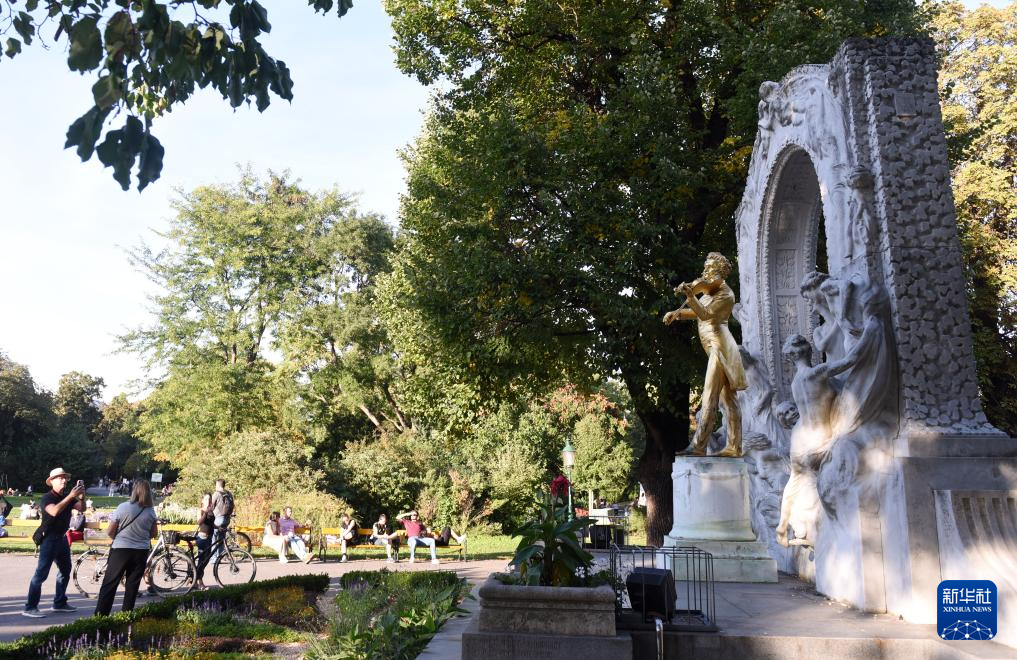 10月2日,游客在奥地利维也纳的小约翰·施特劳斯雕像前参观拍照。