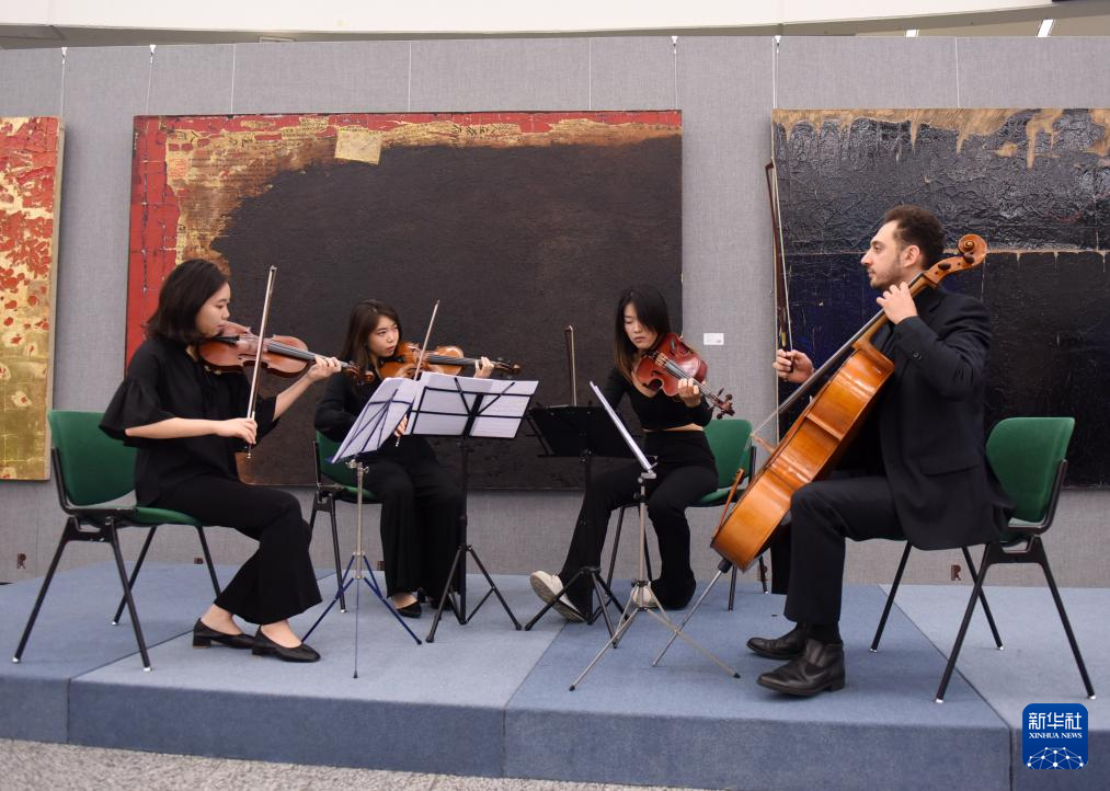 10月6日,在奥地利维也纳,中国留学生黄韵瑜(左一)和黄韵文(左二)在第三届中欧国际艺术双年展开幕式上演奏。