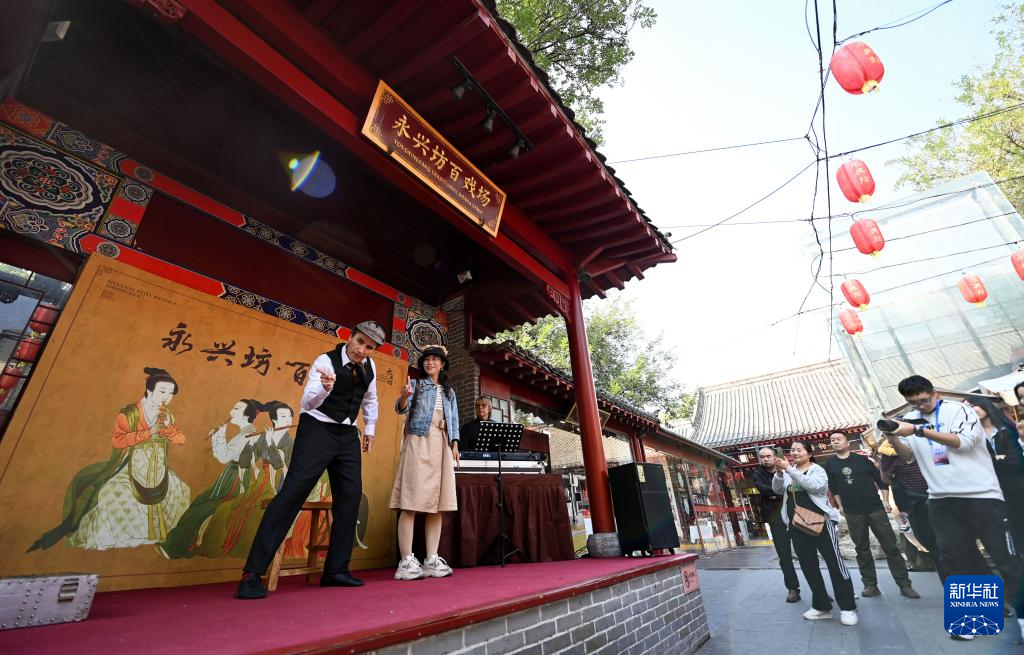 10月16日,来自斯洛伐克法帝西摩剧院的默剧表演艺术家弗拉基米尔·库利塞克(左一)在西安永兴坊进行惠民巡演时与观众互动。