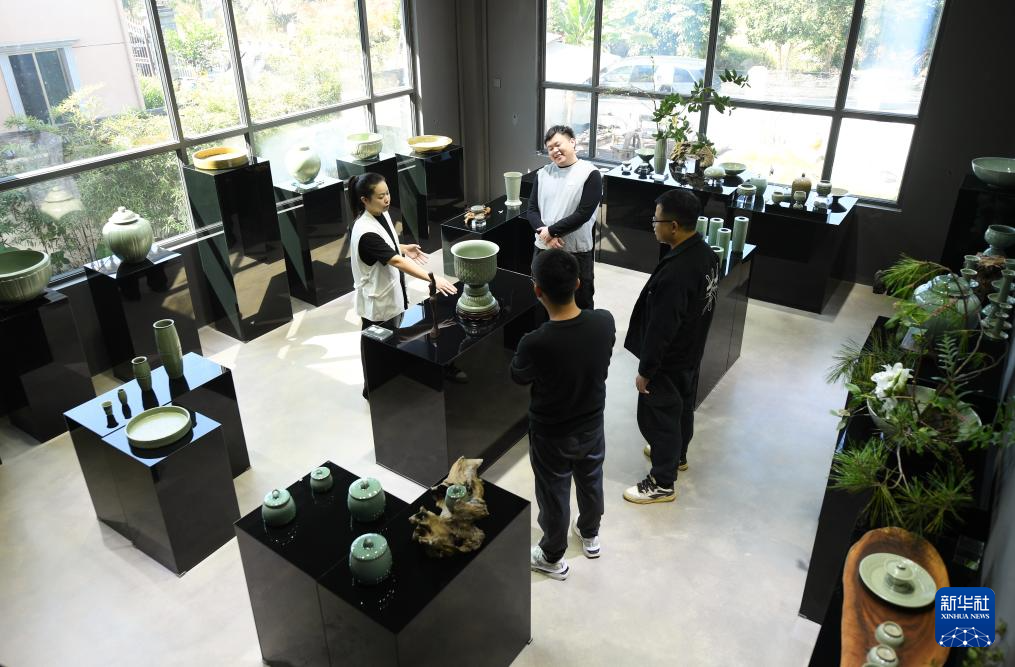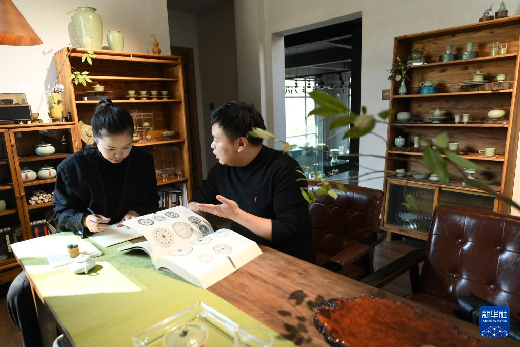 “95后”陶瓷夫妻档季双俊和季资美是高中和大学时的同学,因为共同的兴趣走到一起。从景德镇陶瓷工艺美院毕业后回到故乡龙泉,夫妻二人在瓯江旁的炉田村驻扎下来,成立了“梅夫人”工作室,潜心钻研北宋风格的青瓷器。两人从古瓷中寻找灵感,力图重现北宋龙泉窑的胎釉特点,并借鉴青铜器、金银器、古代服装上的纹样,在瓷上倾注对传统文化的热爱。