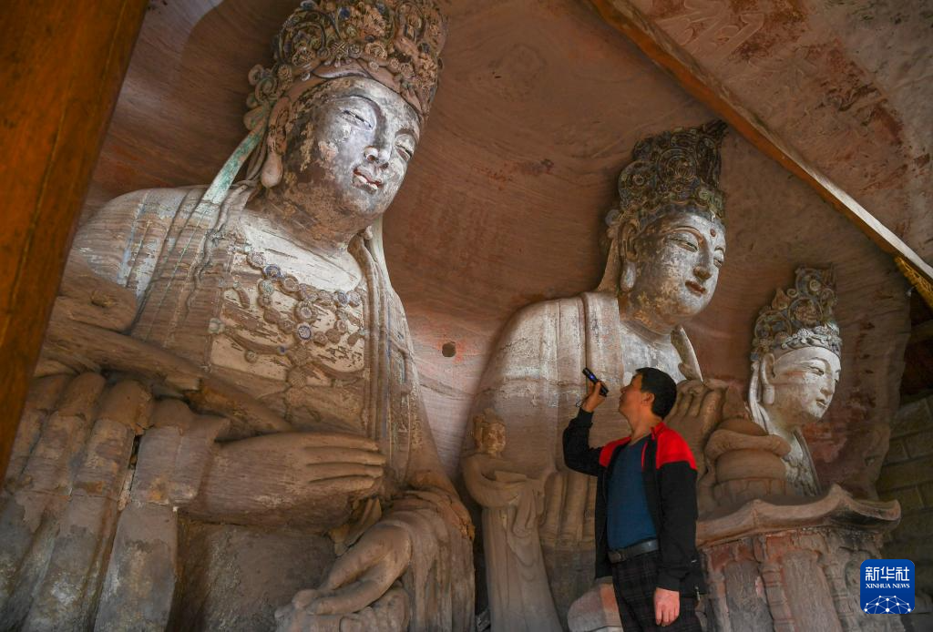 10月31日,在重庆市大足区宝顶镇香山社区,义务文保员在对佛祖岩摩崖造像进行巡查。