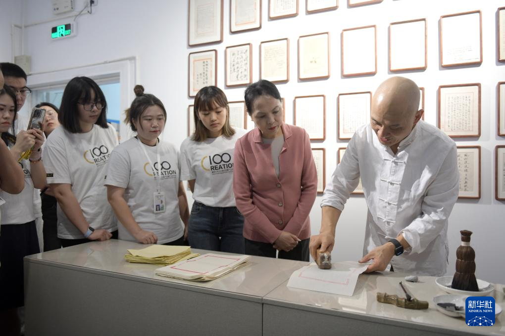 11月8日,魏立中(右一)指导学生体验木版水印手作的乐趣。