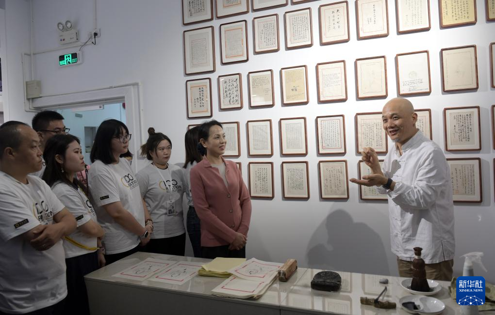 11月8日,魏立中(右一)传授制作木版水印的技艺。
