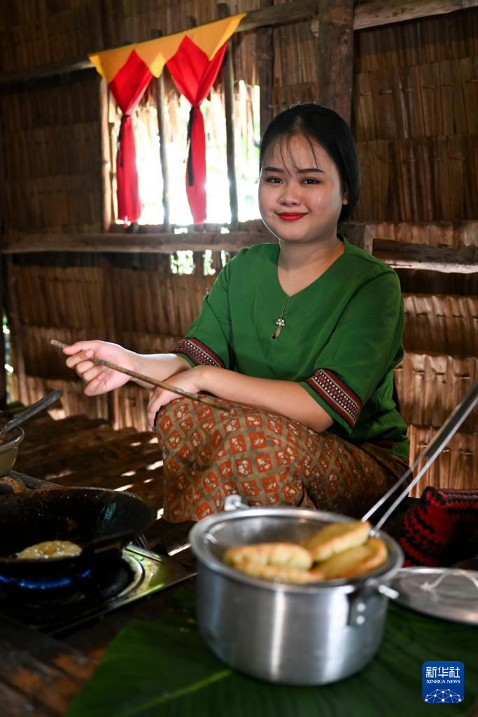 11月14日,在马来西亚沙巴州的马里马里文化村,一名女子制作传统民族食物。
