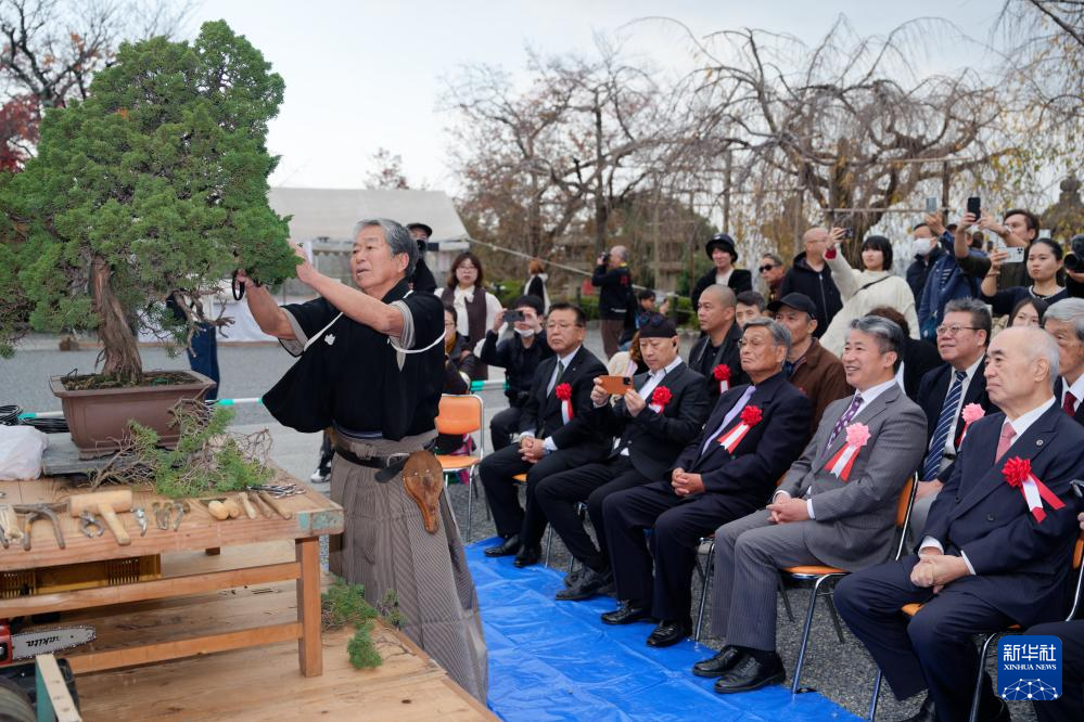 11月24日,在日本京都清水寺举行的中日盆栽水石展开幕式上,日本春花园BONSAI美术馆创始人、盆栽大师小林国雄(左一)表演盆栽作品创作过程。