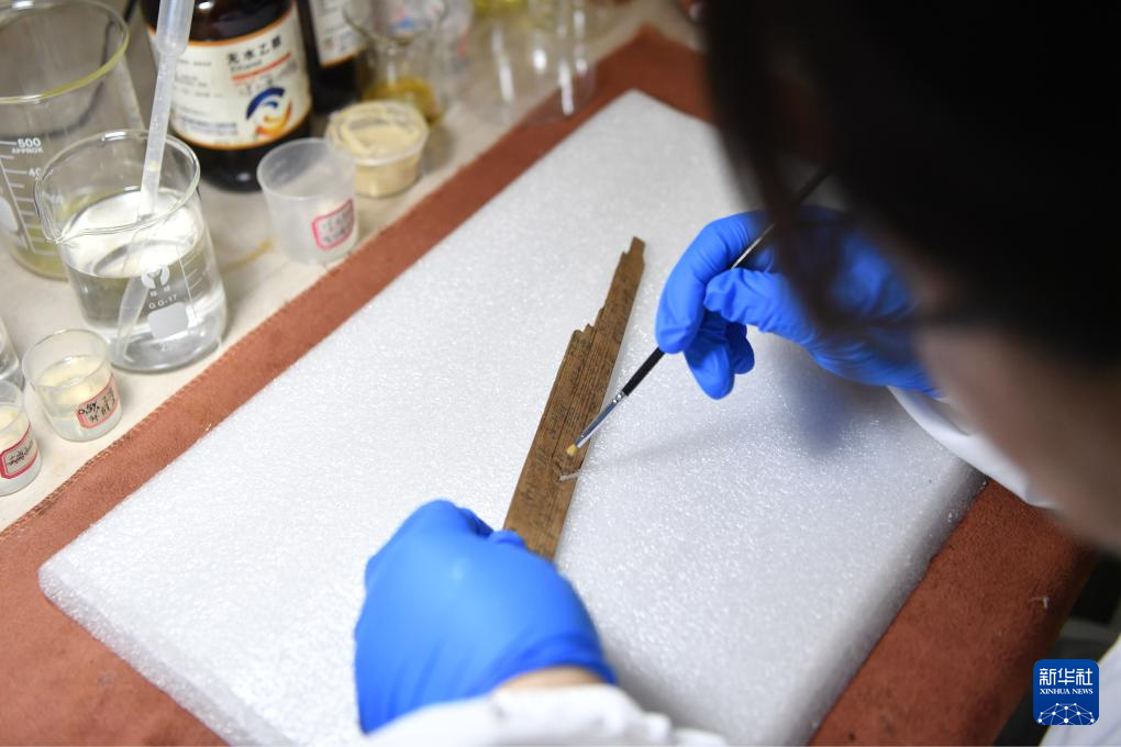 甘肃文博服务中心文物修复师李媛在清理待修复的简牍(10月26日摄)。