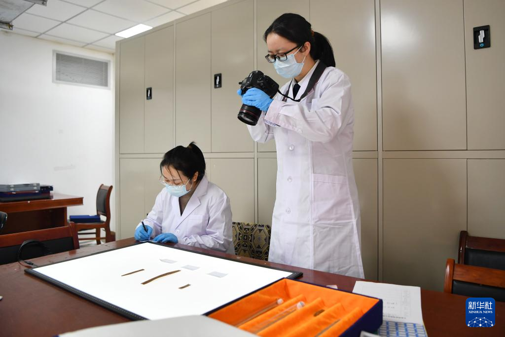 甘肃简牍博物馆科技保护部文物库房管理员杨升(右)和同事常晓丽在整理登记简牍信息(10月26日摄)。
