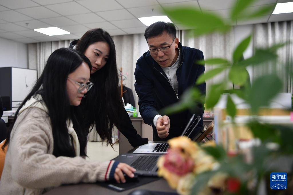 甘肃简牍博物馆整理研究部主任肖从礼(右一)和同事交流简牍数字化工作(10月25日摄)。