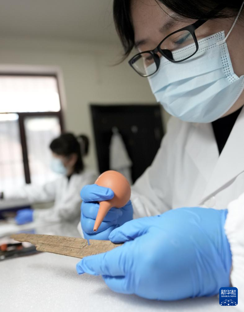 甘肃文博服务中心文物修复师李媛在清理简牍上灰尘(10月26日摄)。