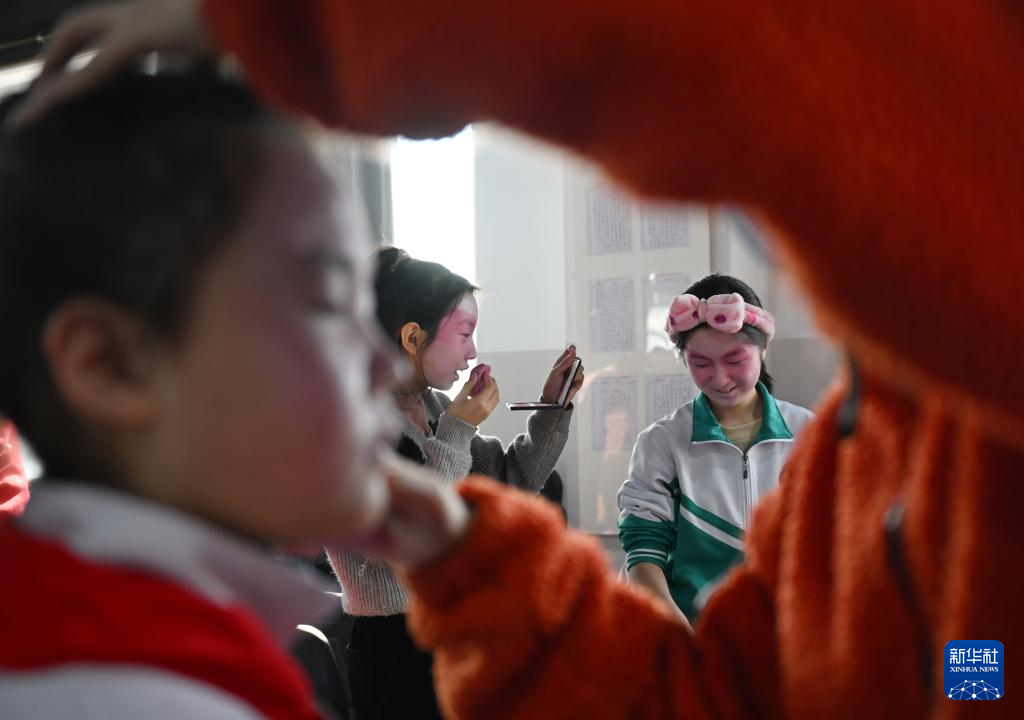 12月27日,在保定市河北小学,学生在上台演出前化装。