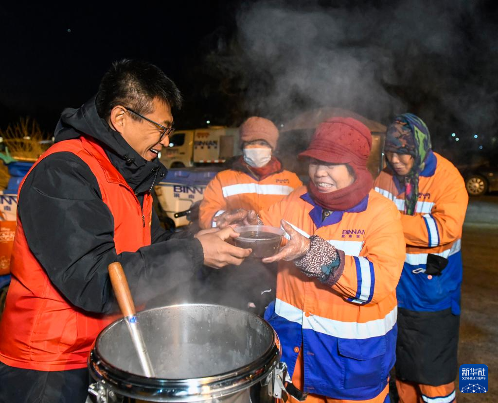 1月18日,在山东省临沂市平邑县地方镇街头,志愿者为环卫工人盛腊八粥。