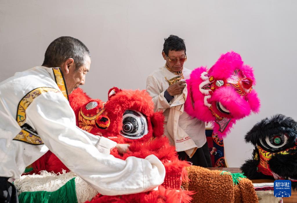在位于西藏昌都市洛隆县硕督镇硕督村的家中,邓巴阿尼(右)在擦拭狮子舞道具(1月19日摄)。