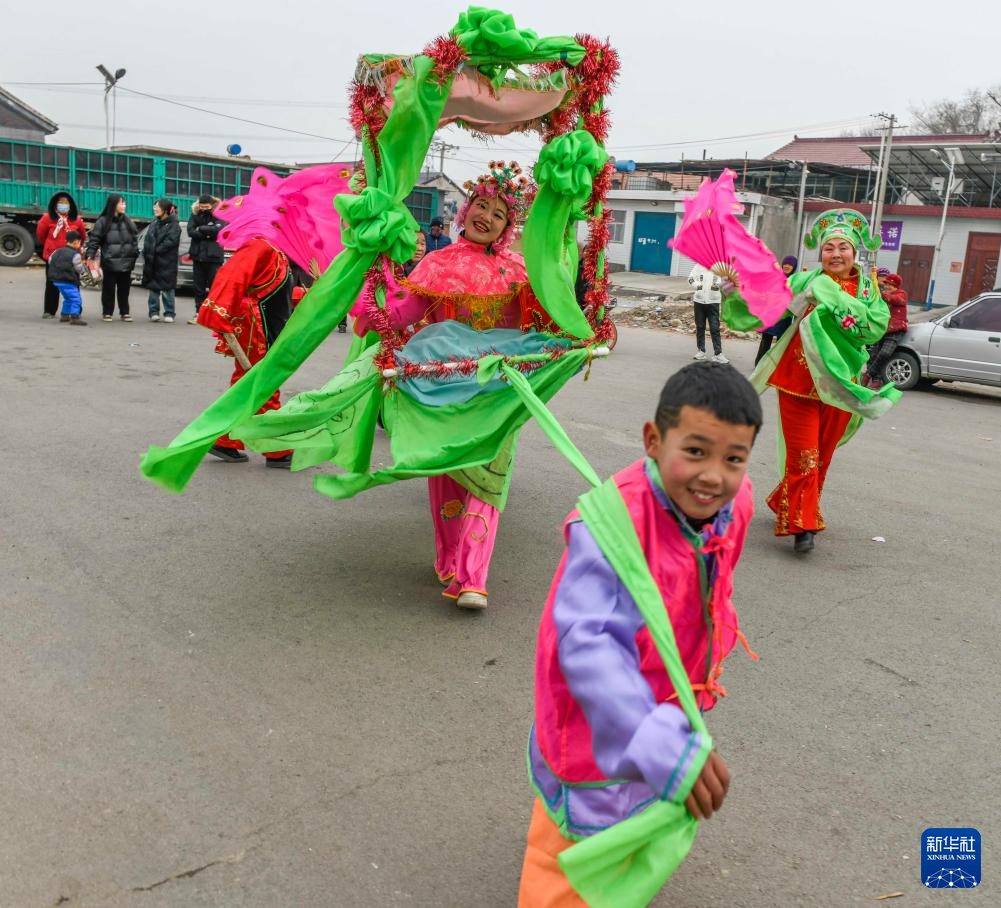 2月4日,河北省遵化市汤泉满族乡关山口村民间艺人在表演太平车民俗节目。