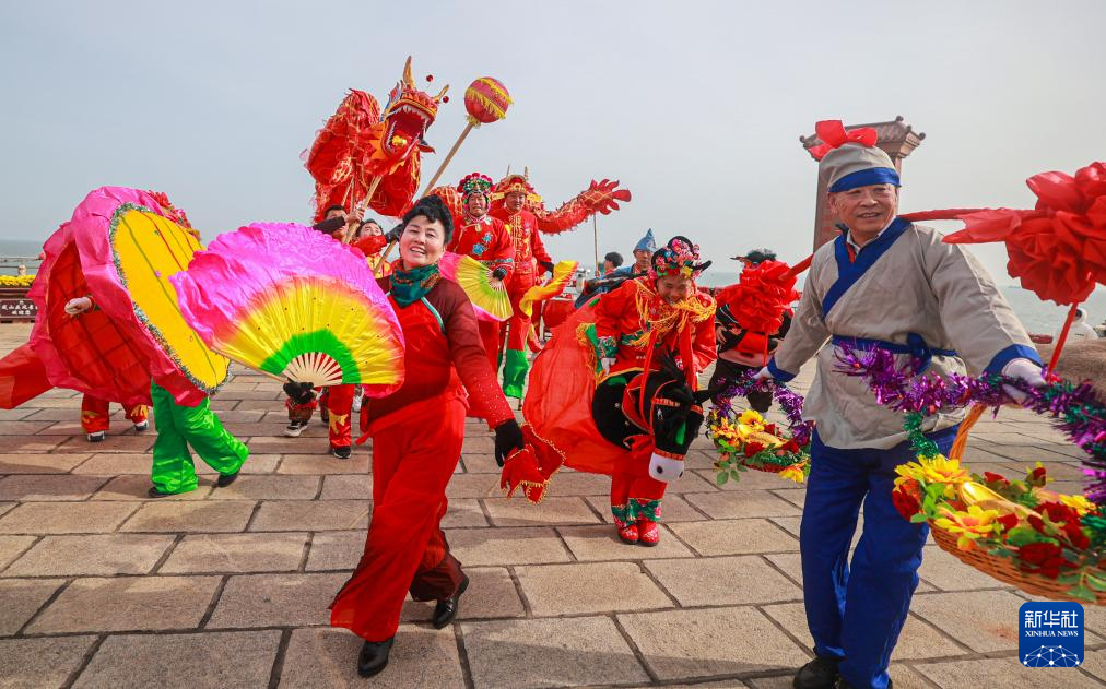 2月4日,在山东省荣成市成山头风景区,民间艺人在进行渔家秧歌、杂耍、舞龙表演。