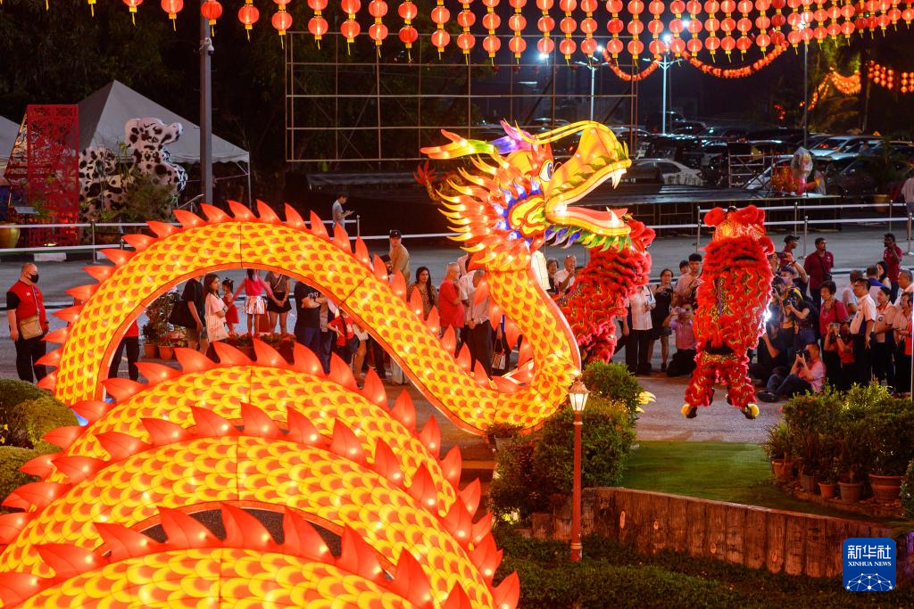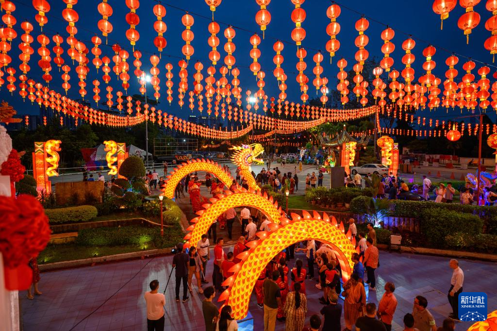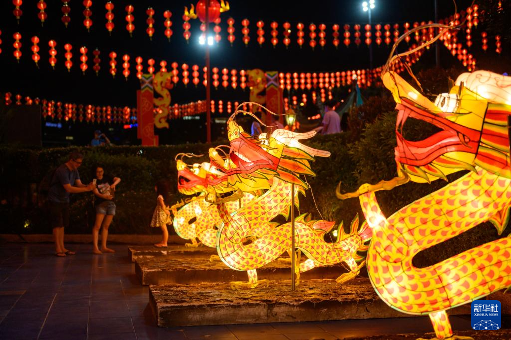 吉隆坡天后宫点亮以龙为主题的彩灯装置迎接龙年的到来。
