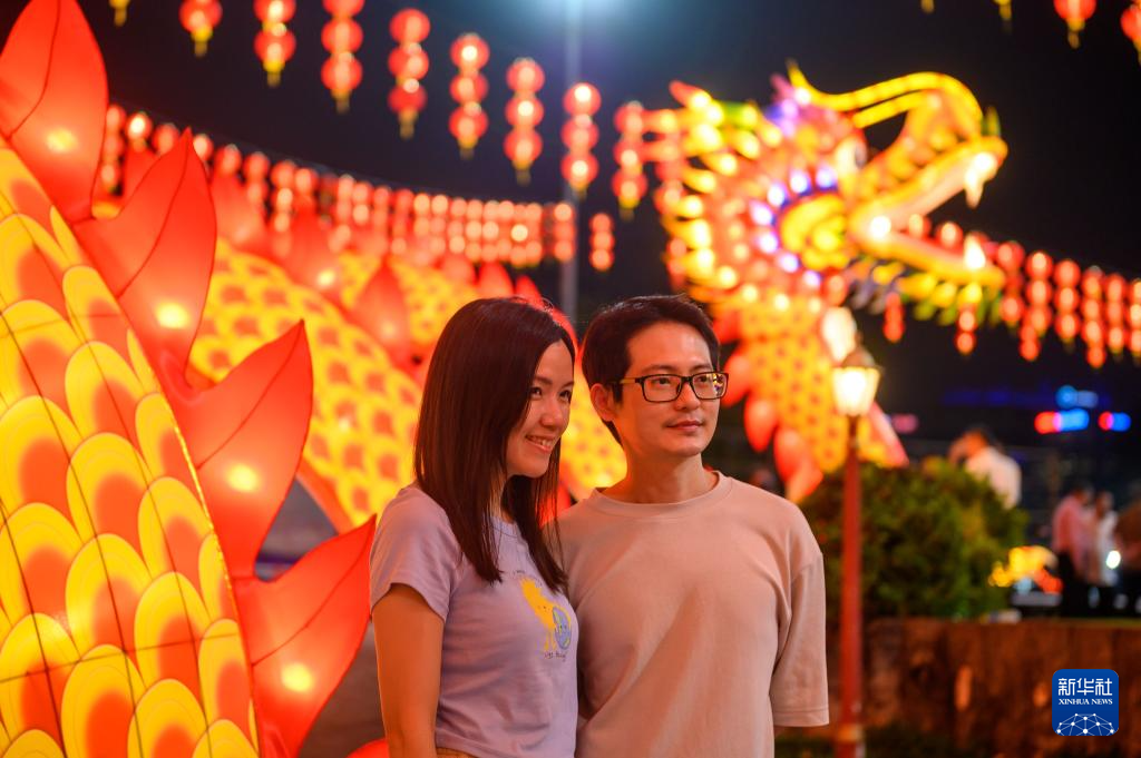 2月3日,马来西亚吉隆坡天后宫,游客与龙形彩灯装置合影。