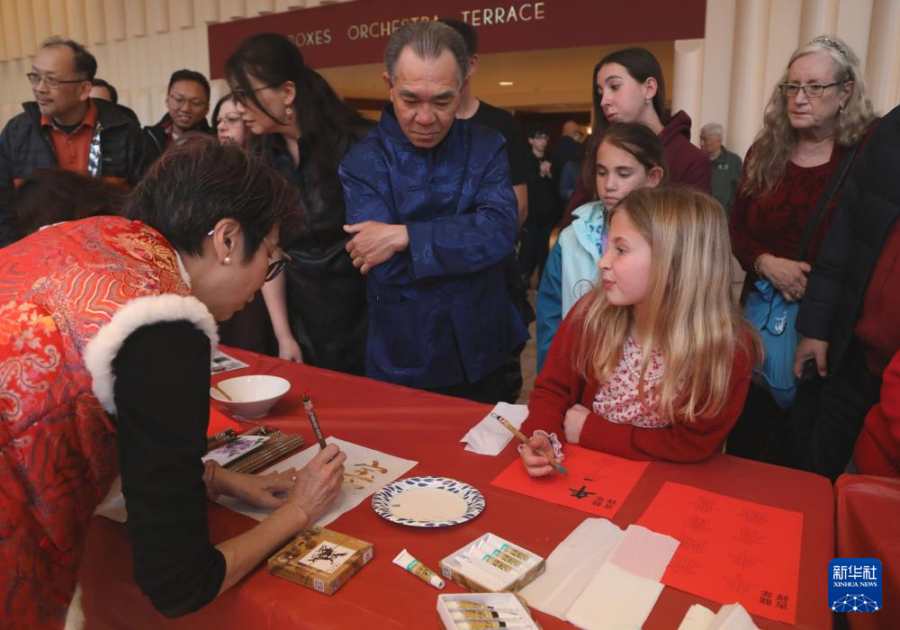 2月17日,在美国旧金山戴维斯音乐厅,一名女孩跟随书法家体验中国书法。