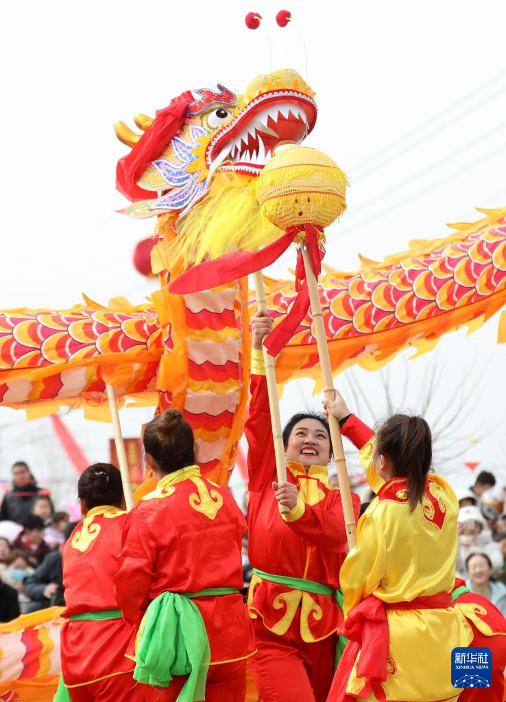 2月19日,在浙江省宁波市北仑区柴桥街道,艺人在舞龙展演(无人机照片)。