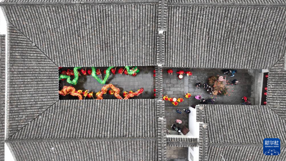 2月20日,农民舞龙队在浙江省湖州市德清县乾元镇直街社区余不弄表演舞龙(无人机照片)。