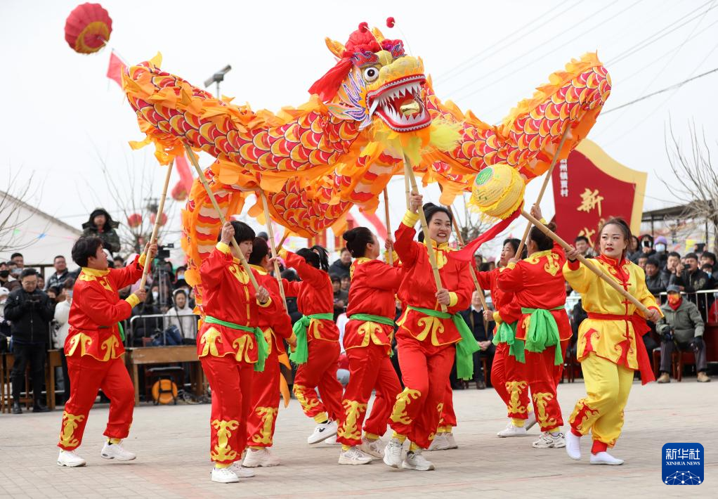 2月19日,在河北省沧县旧州镇贾村,演出队伍在表演舞龙。