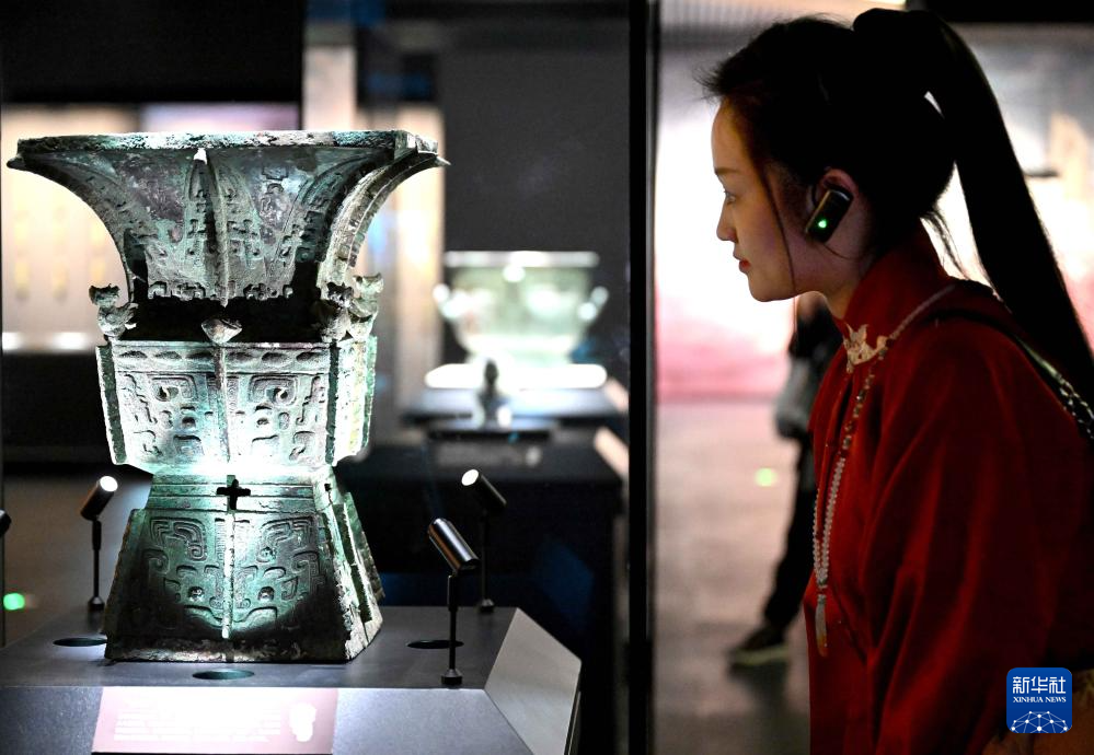 2月26日,参观者在河南安阳殷墟博物馆新馆内观看“亚长”铜方斝。